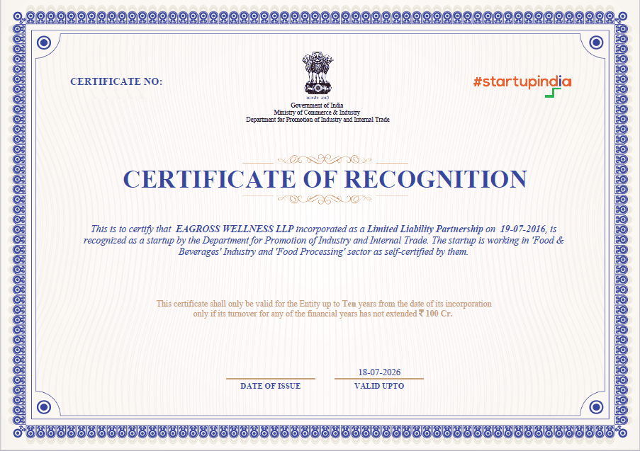 We, at Eagross Wellness, the makers of Radix Nutritive® - Gluten-free, Vegan and Millet products, are humbled to receive "Certificate of Recognition" from Startup India, Department for Promotion of Industry and Internal Trade (DPIIT), Ministry of Commerce and Industry, Government of India.
